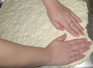4. Противень смазать 2 чл. растительного масла, выложить тесто в центр. Поставить рядом тарелку с водой, и постоянно смачивая руки (чтобы тесто не прилипало), растянуть тесто на весь противень.