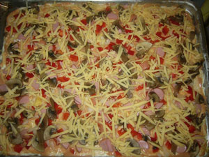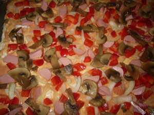 3. Пока тесто стоит, нарезать пластинками шампиньоны, и потушить не до полной готовности на сковороде без масла. Чуть-чуть посолить. Нарезать перец, лук, сосиски - кубиками, сыр натереть на крупной терке